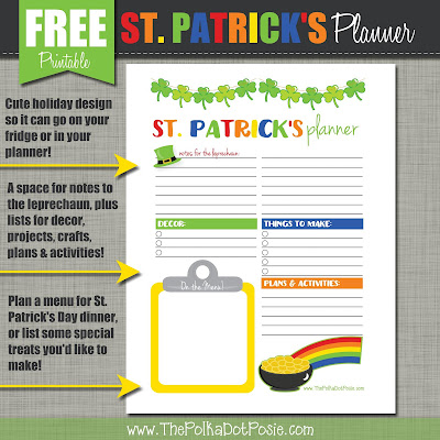 While we wait for the sunshine, it's time to start planning for St. Patrick's Day! Does the Leprechaun visit your home or classroom? Do you have a Pinterest board full of fun St. Patrick's day crafts and activities? Do you plan a special meal every year (my hubby can't live without his corned beef and cabbage)? Our newest one-page holiday planner will help you organize all of that and more!