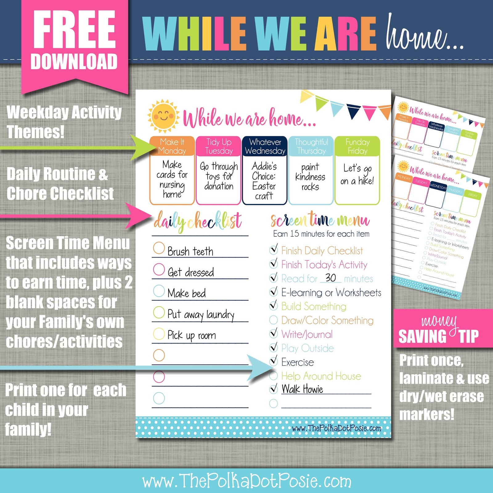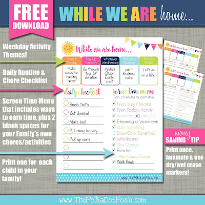 We noticed over the last few days that our Summer Schedule Printable (with screen time menu) has spiked and a few customers have actually reached out to ask if we could adapt that schedule for parents who are now going to spend at least the next few weeks at home with their kids. We thought this was an EXCELLENT idea. We struggled with a new name for the schedule, since we don't want to draw any more attention to those scary words like "Pandemic" or "Covid-19" so we are simply naming this schedule "While we are home..."